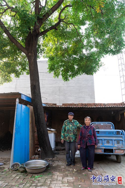 贾章定老两口在院子里的老槐树下合影留念。中国雄安官网记者毛鹤然 摄