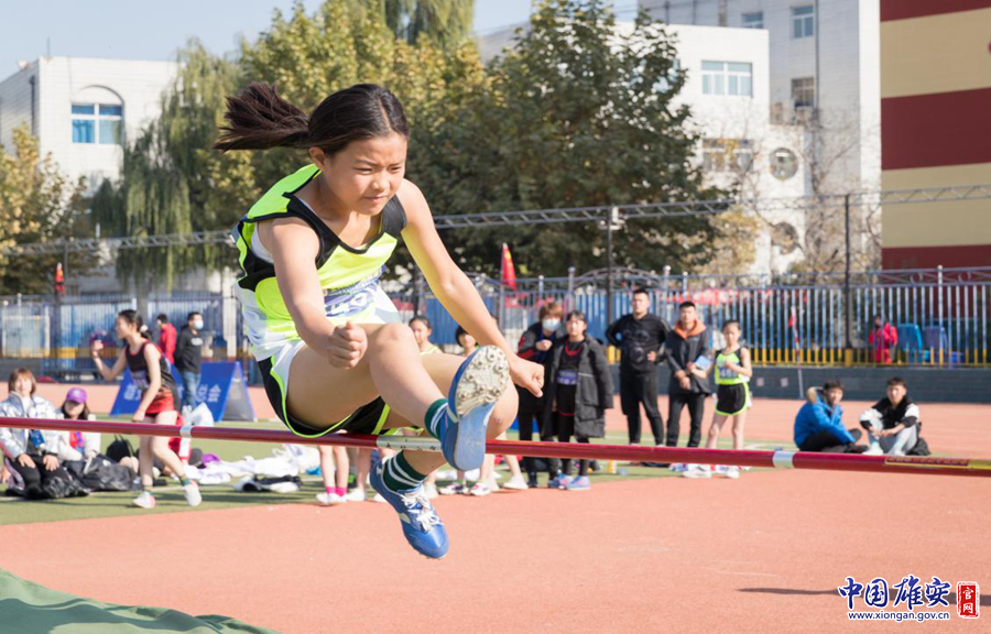 首届雄安新区中小学生运动会比赛现场,运动员正在进行跳高比赛。中国雄安官网记者刘东尧 摄