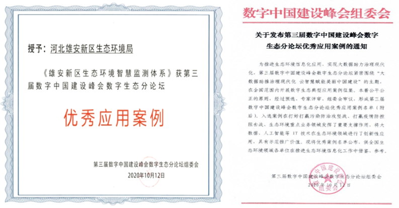 “雄安新区生态环境智慧监测体系”建设成果荣获第三届数字中国建设峰会数字生态分论坛优秀应用案例。中国雄安官网发