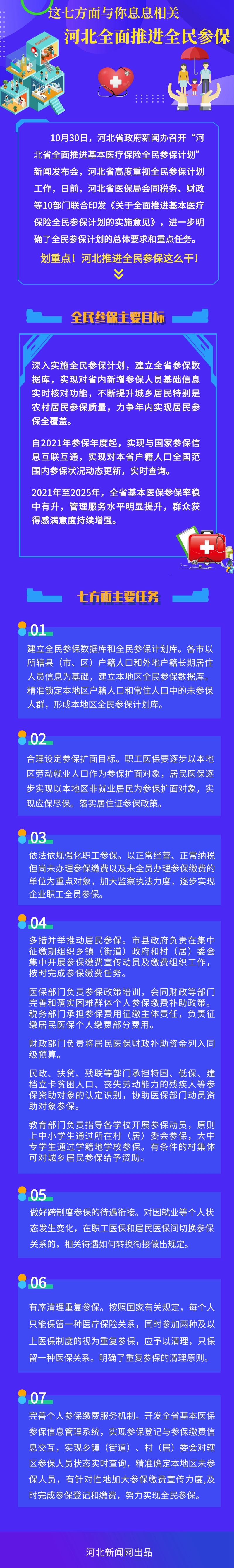 10月30日,河北省政府新闻办召开“河北省全面推进基本医疗保险全民参保计划”新闻发布会,河北省高度重视全民参保计划工作,日前,河北省医保局会同税务、财政等10部门联合印发《关于全面推进基本医疗保险全民参保计划的实施意见》,进一步明确了全民参保计划的总体要求和重点任务。