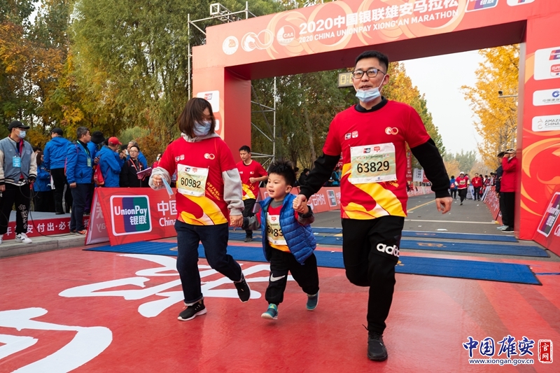 热情参与2020雄安马拉松赛事的一家三口牵手体验冲过终点。中国雄安官网记者毛鹤然 摄