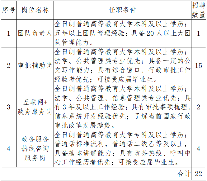 为进一步增加雄安新区政务服务中心政务服务供给,提高政务服务水平,推动实现政务服务“一门、一次、一网”目标,根据工作需要,河北京雄政务服务外包有限公司受河北雄安新区管理委员会公共服务局委托,招聘公共服务局审批辅助服务岗位工作人员。现公告如下: