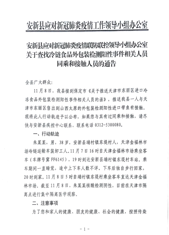 雄安安新县一男子曾接触外包装检测阳性进口带鱼,寻找密接者