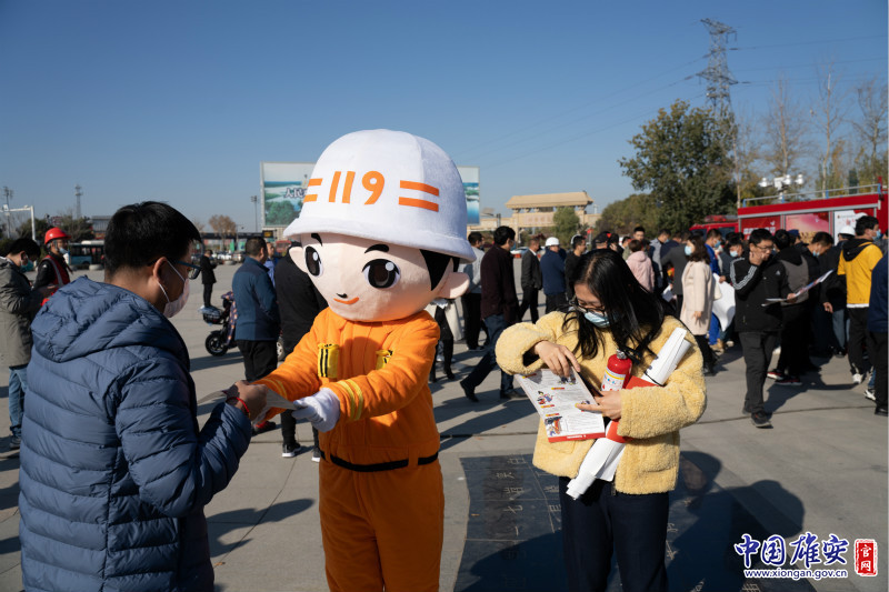消防知识宣传吉祥物为现场群众发放宣传海报。中国雄安官网记者刘东尧 摄
