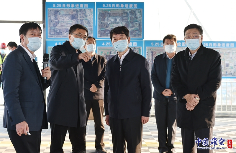 2020年11月10日,中央宣讲团成员,中央改革办分管日常工作的副主任,国家发展改革委党组副书记、副主任穆虹(右三)在雄安新区雄安商务服务中心项目建设现场调研。河北日报记者赵海江 摄