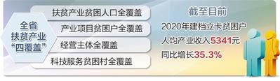 2020年,我省产业扶贫项目贫困户二重覆盖率达89%,比2019年提高25个百分点,剩余3.4万贫困人口达到产业项目两重覆盖并实现全部脱贫,9.7万防贫对象全部落实产业帮扶措施。截至目前,2020年建档立卡贫困户人均产业收入5341元,同比增长35.3%。