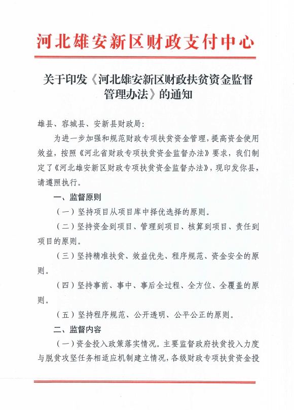 关于印发《河北雄安新区财政扶贫资金监督管理办法》的通知