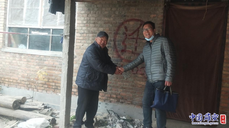 一位征迁村村民的房屋刚刚被喷上“迁”字,他紧紧地握着征迁工作人员的手,表示支持新区征迁工作。中国雄安官网发