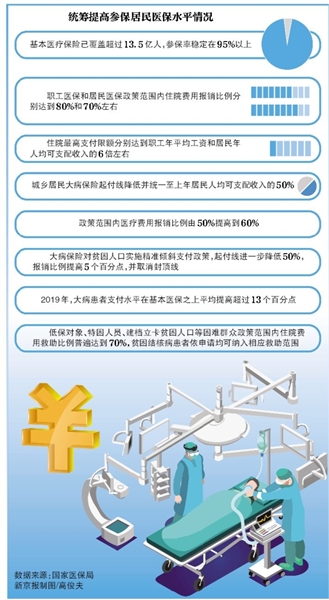 城乡居民大病保险起付线降低并统一至上年居民人均可支配收入的50%,政策范围内医疗费用报销比例由50%提高到60%。同时,大病保险对贫困人口实施精准倾斜支付政策,起付线进一步降低50%,报销比例提高5个百分点,并取消封顶线。2019年,大病患者支付水平在基本医保之上平均提高超过13个百分点。
