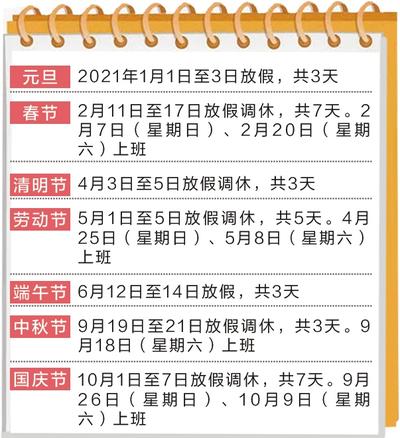 15.2021年元旦、春节、清明节、劳动节、端午节、中秋节和国庆节放假调休日期的具体安排公布,其中劳动节连休五天。