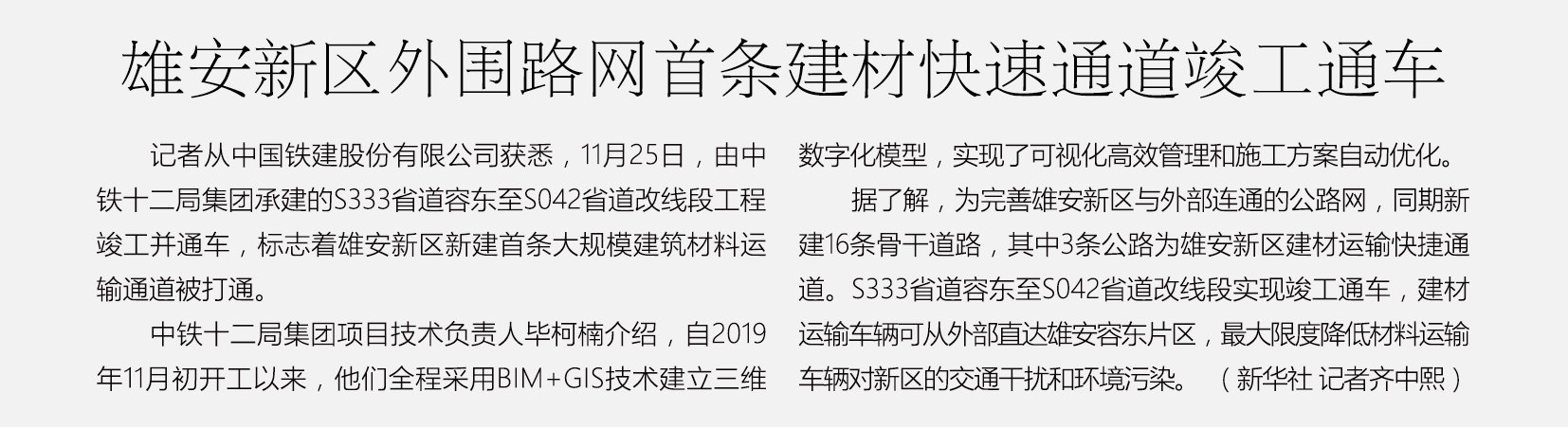 S333省道容东至S042省道改线段实现竣工通车,建材运输车辆可从外部直达雄安容东片区,最大限度降低材料运输车辆对新区的交通干扰和环境污染。