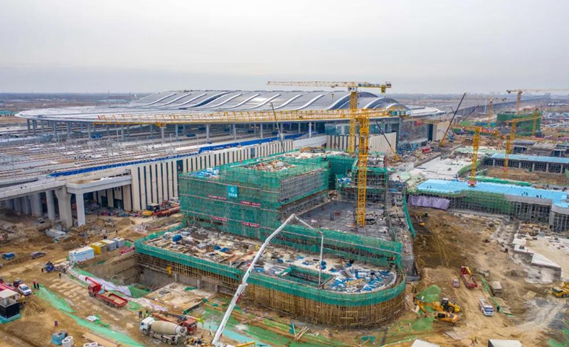 西侧干路北段再往北,雄安站西广场上,雄安站站体配套综合商业项目主体工程也在争分夺秒地建设中。位于南北两侧的两个单体建筑,就像是雄安站的“两只眼睛”。
