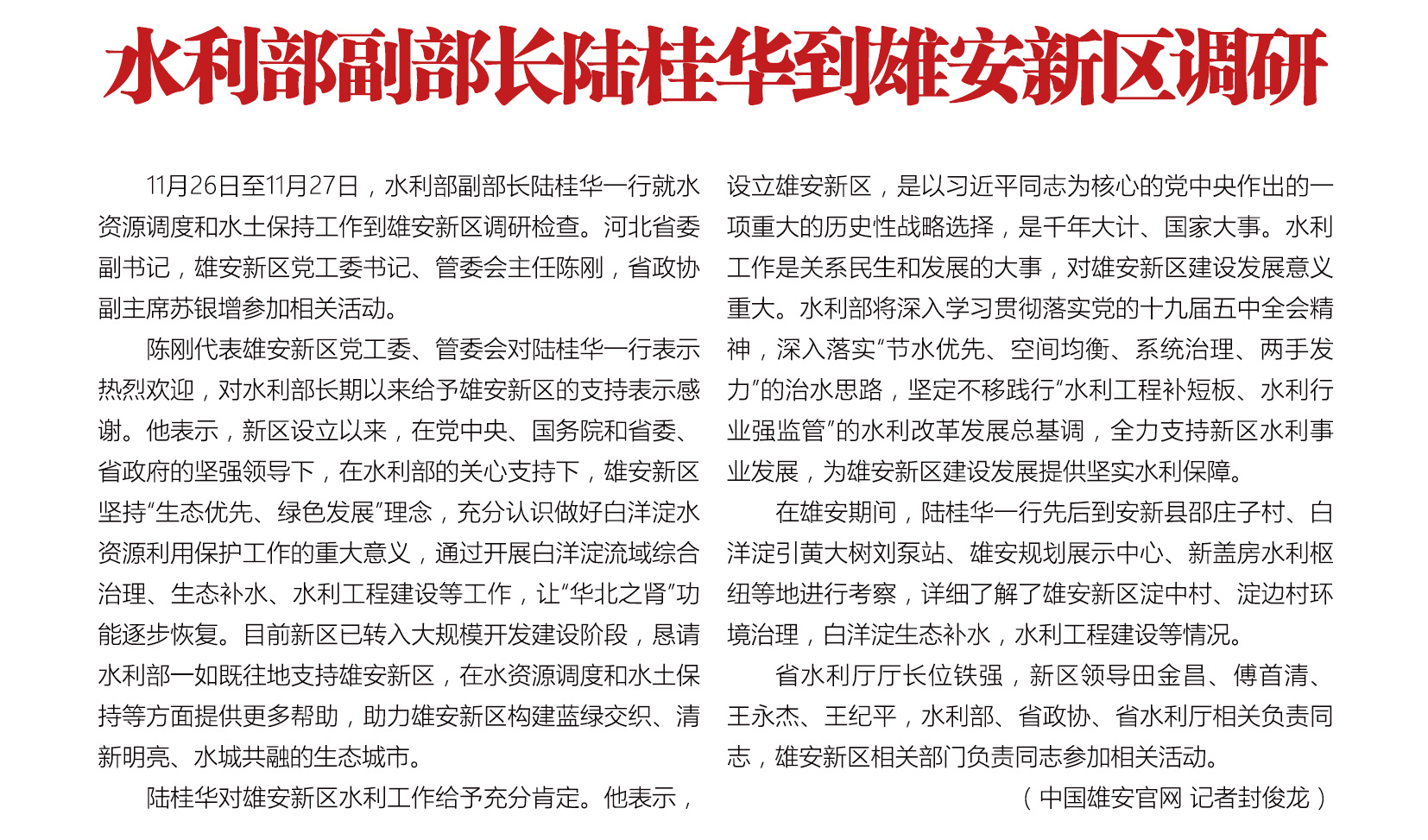 11月26日至11月27日,水利部副部长陆桂华一行就水资源调度和水土保持工作到雄安新区调研检查。