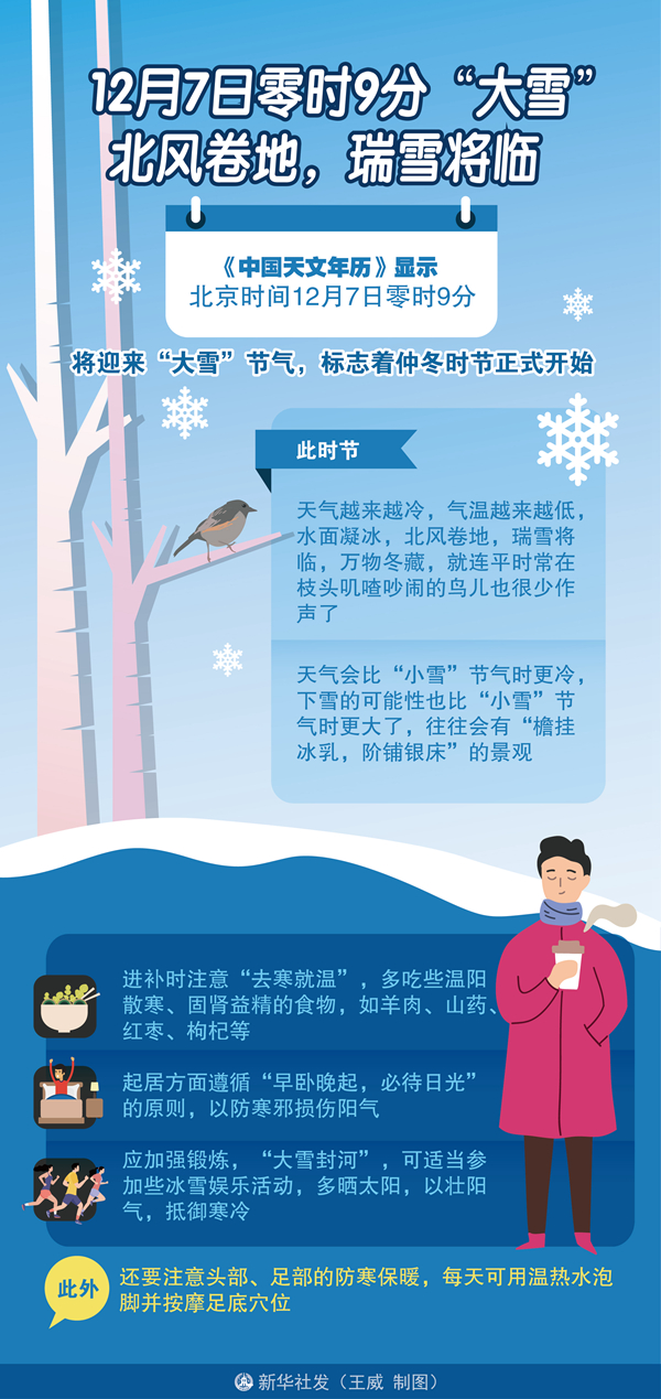 “大雪”时节,阴气最盛,但盛极而衰,阳气有所萌动。罗澍伟建议公众,进补时注意“去寒就温”,多吃些温阳散寒、固肾益精的食物,如羊肉、山药、红枣、枸杞等;起居方面,遵循“早卧晚起,必待日光”的原则,以防寒邪损伤阳气。应加强锻炼,“大雪封河”,可适当参加些冰雪娱乐活动,多晒太阳,以壮阳气,抵御寒冷。此外,还要注意头部、足部的防寒保暖,每天可用温热水泡脚并按摩足底穴位。