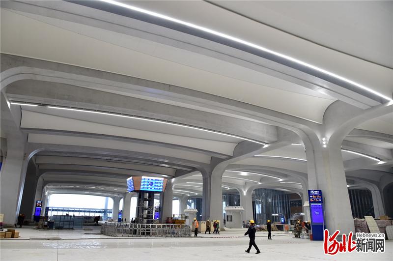 玻璃幕墙安装、吊顶造型板安装、地面铺装、照明安装……雄安站的一层候车大厅里,一系列内装修和机电安装工作都在有条不紊地进行着,雄安站建设进入了最后的冲刺阶段,建设者们争分夺秒干劲儿十足。
