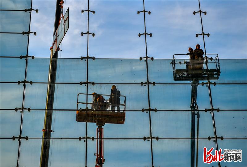 2020年12月2日,施工人员在安装玻璃幕墙。
