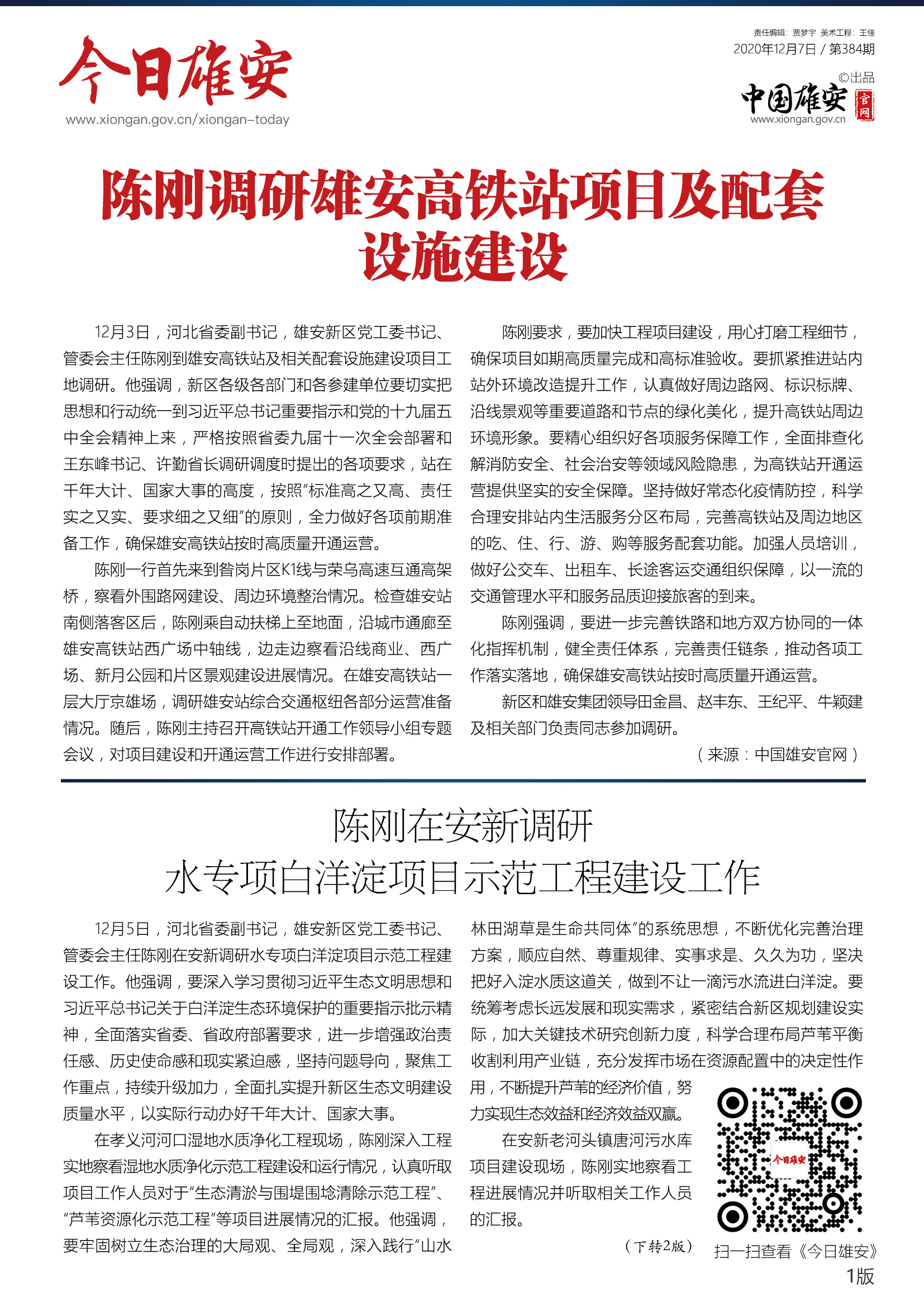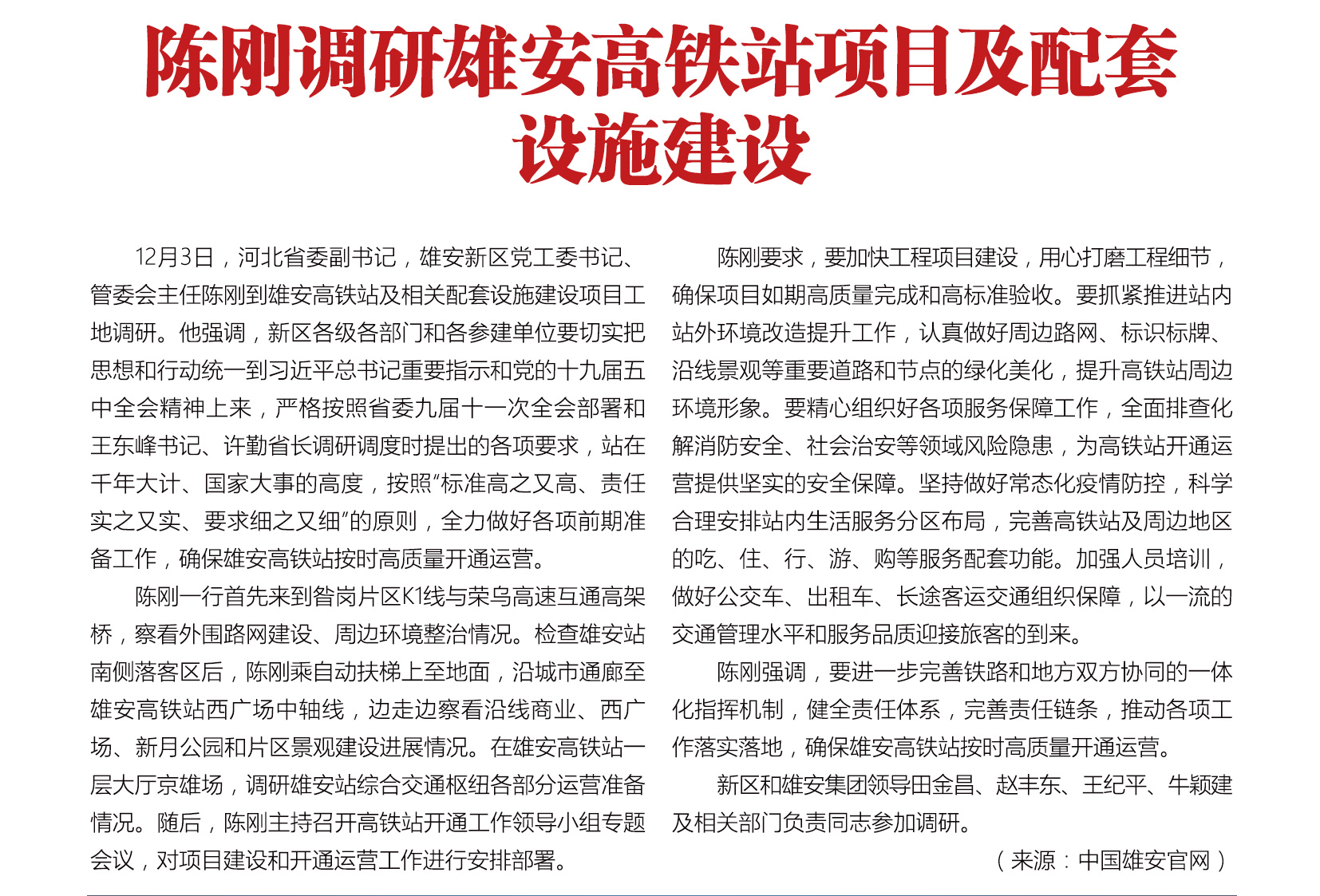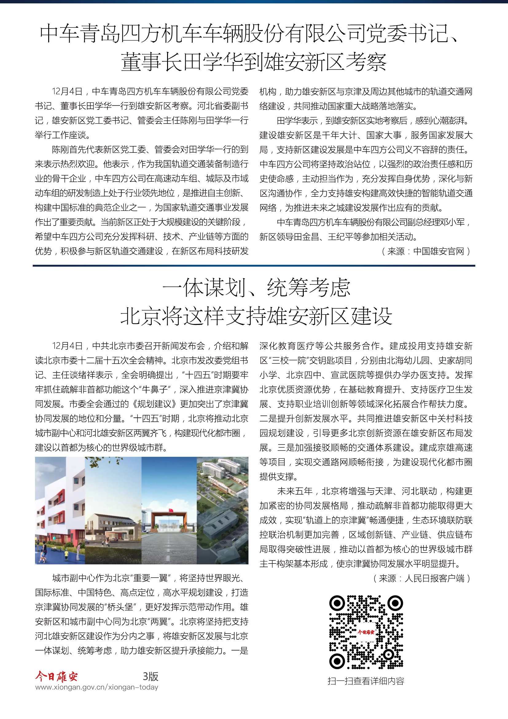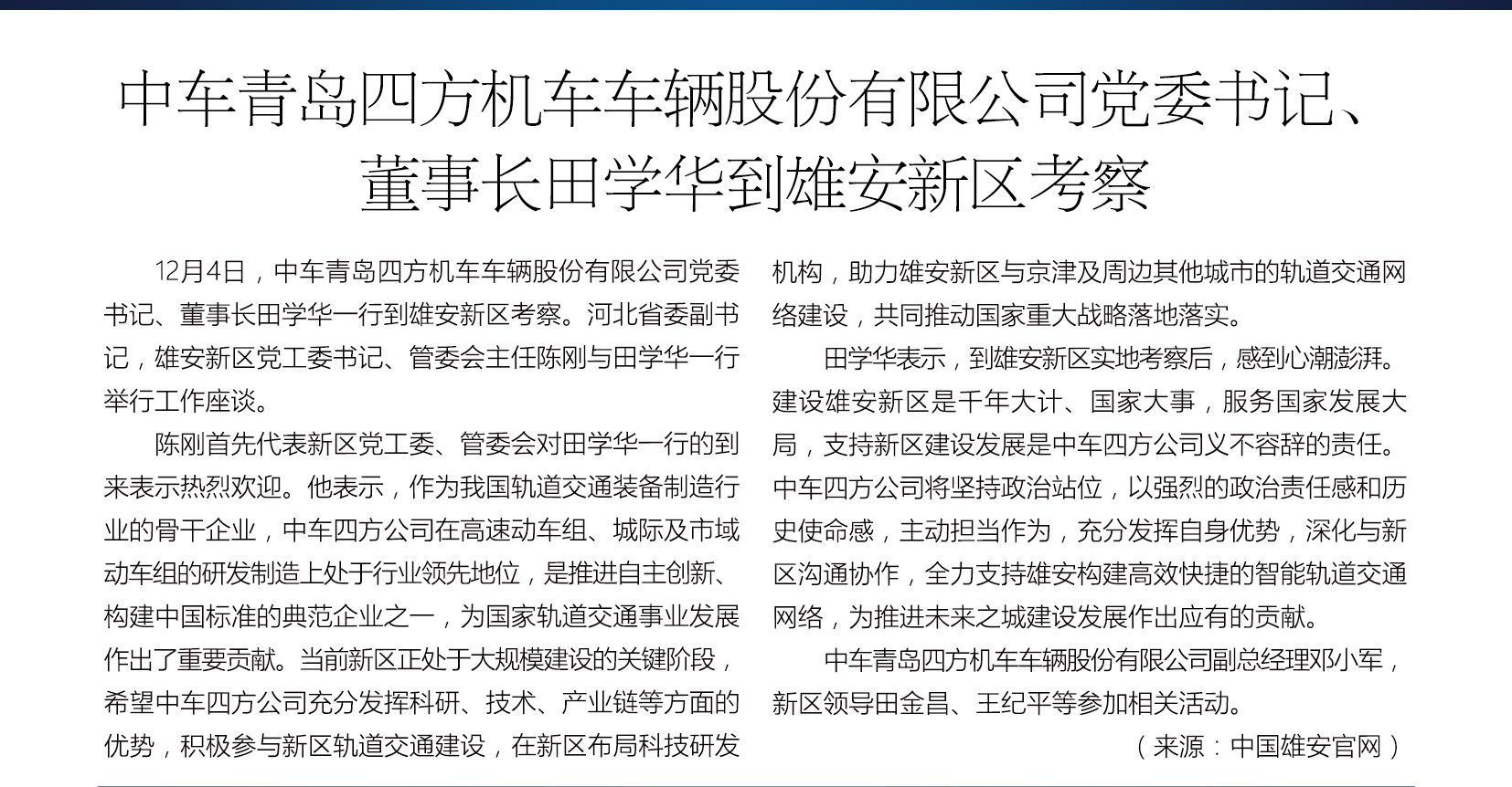12月4日,中车青岛四方机车车辆股份有限公司党委书记、董事长田学华一行到雄安新区考察。
