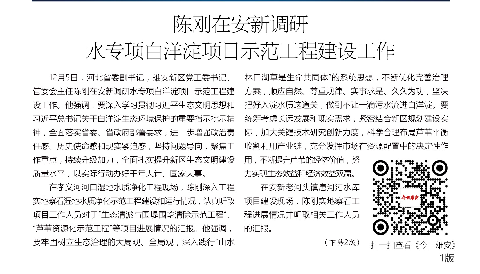 陈刚在安新调研水专项白洋淀项目示范工程建设工作
