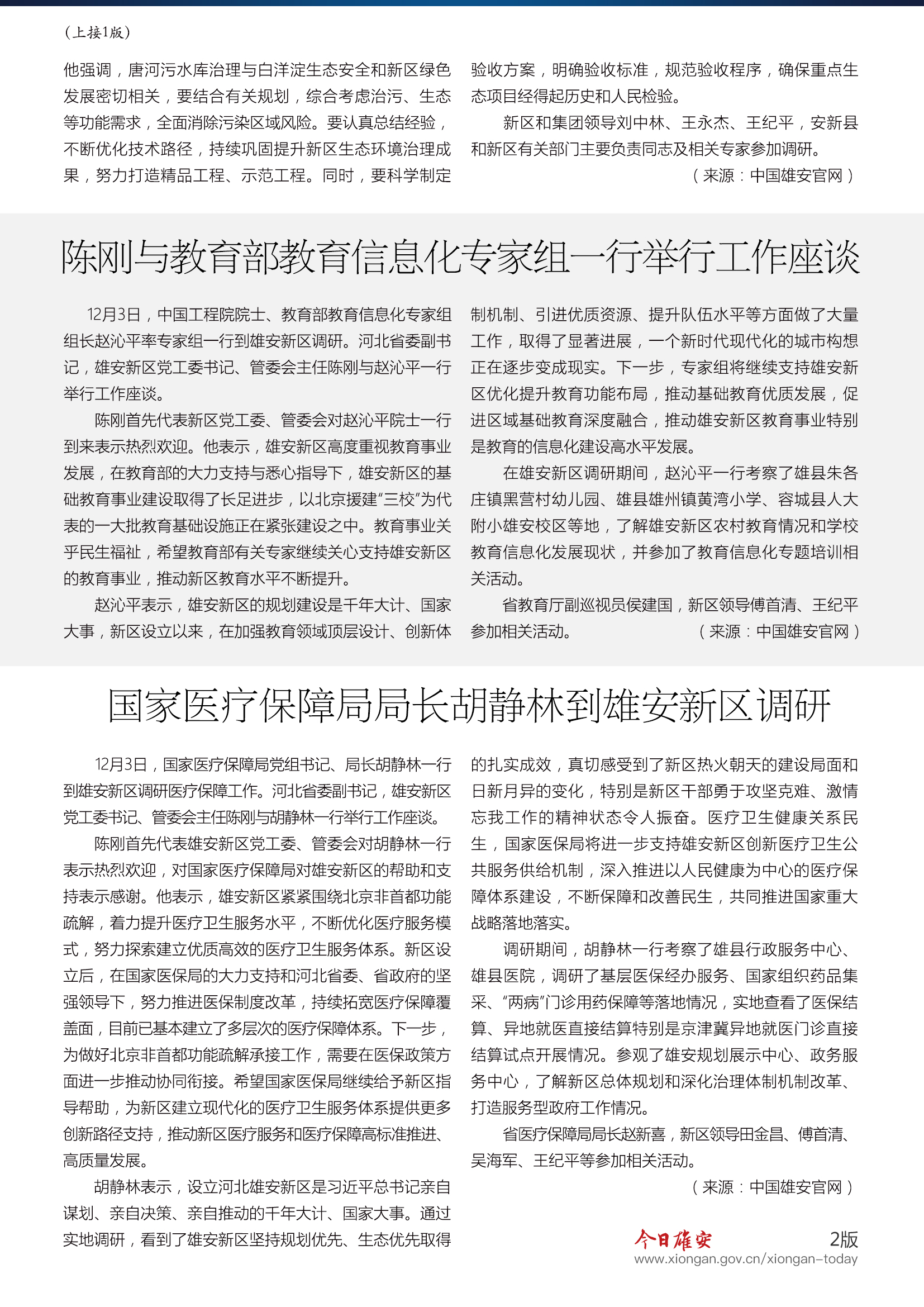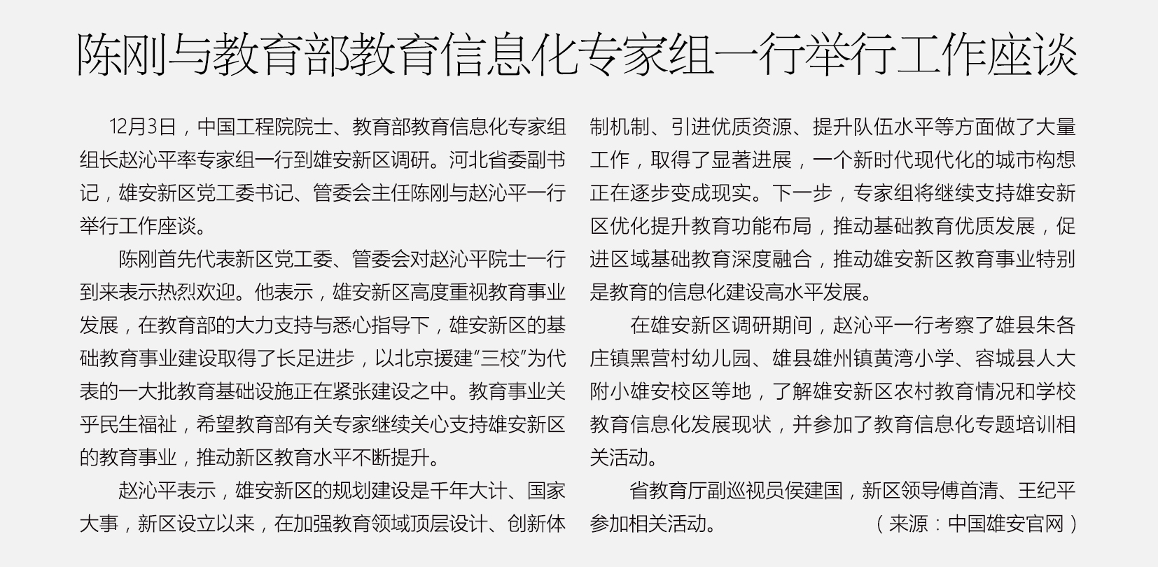 陈刚表示,教育事业关乎民生福祉,希望教育部有关专家继续关心支持雄安新区的教育事业,推动新区教育水平不断提升。
