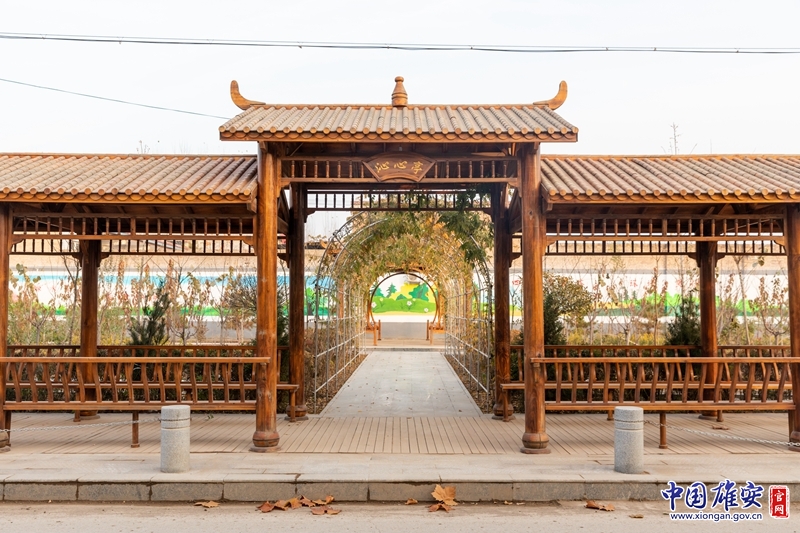 在东河岗村的小公园里,长廊正中凉亭上书“沁心亭”三字。中国雄安官网记者毛鹤然 摄