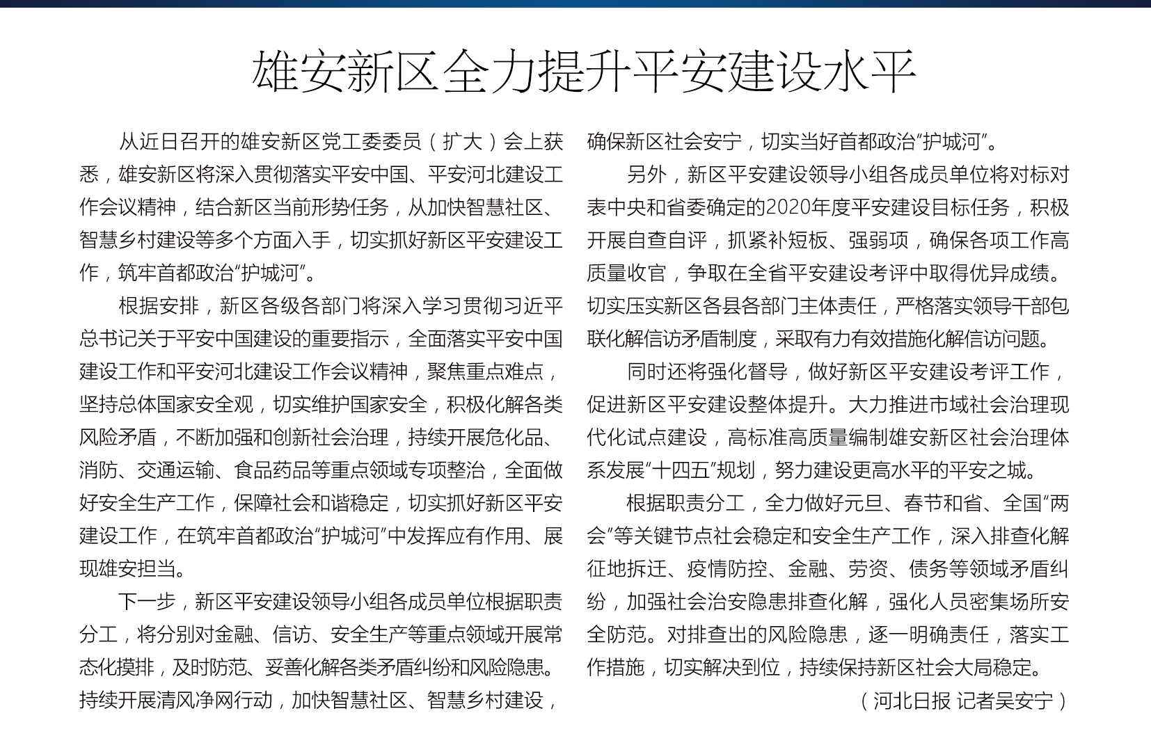 新区平安建设领导小组各成员单位根据职责分工,将分别对金融、信访、安全生产等重点领域开展常态化摸排,及时防范、妥善化解各类矛盾纠纷和风险隐患。