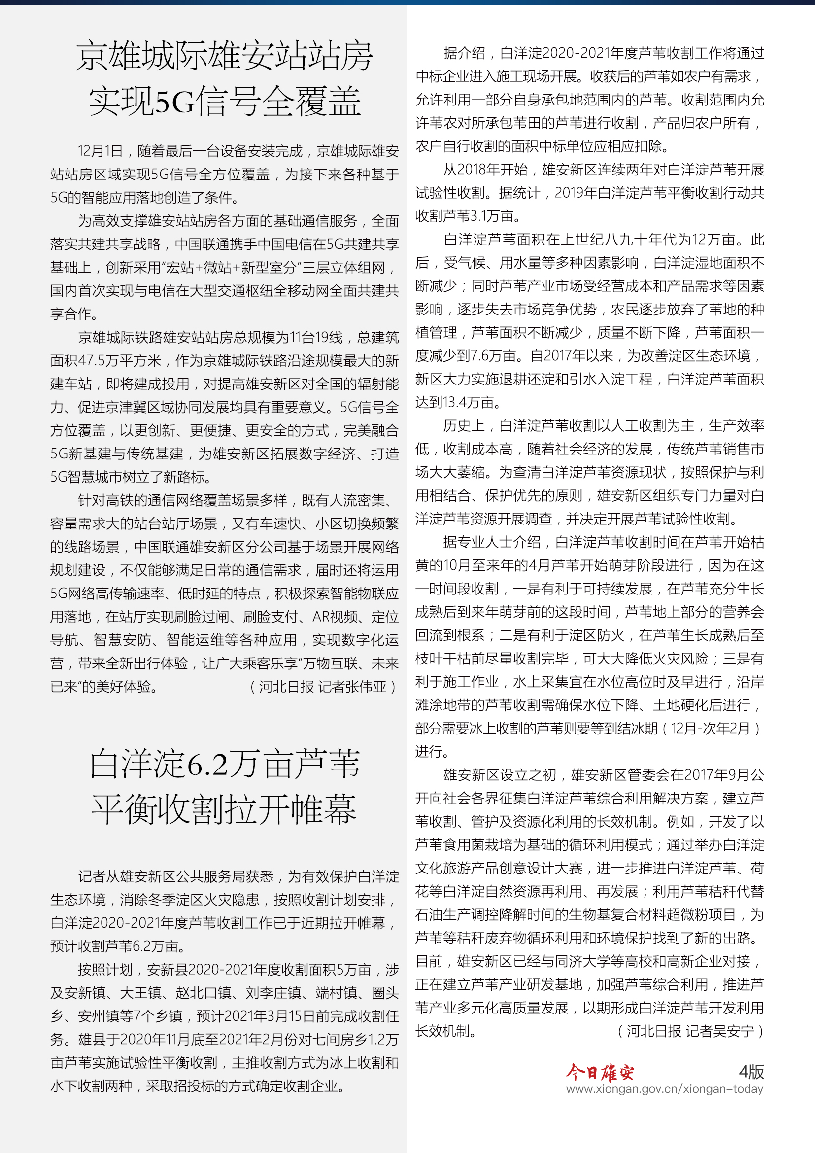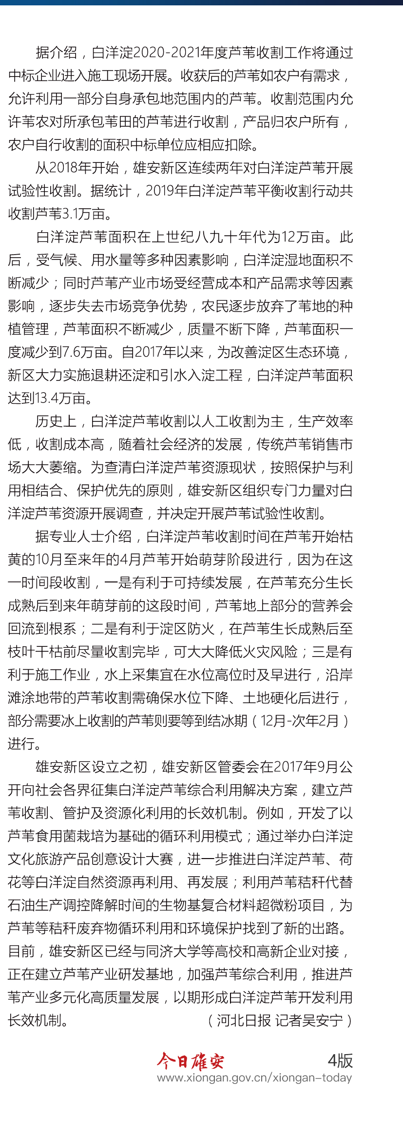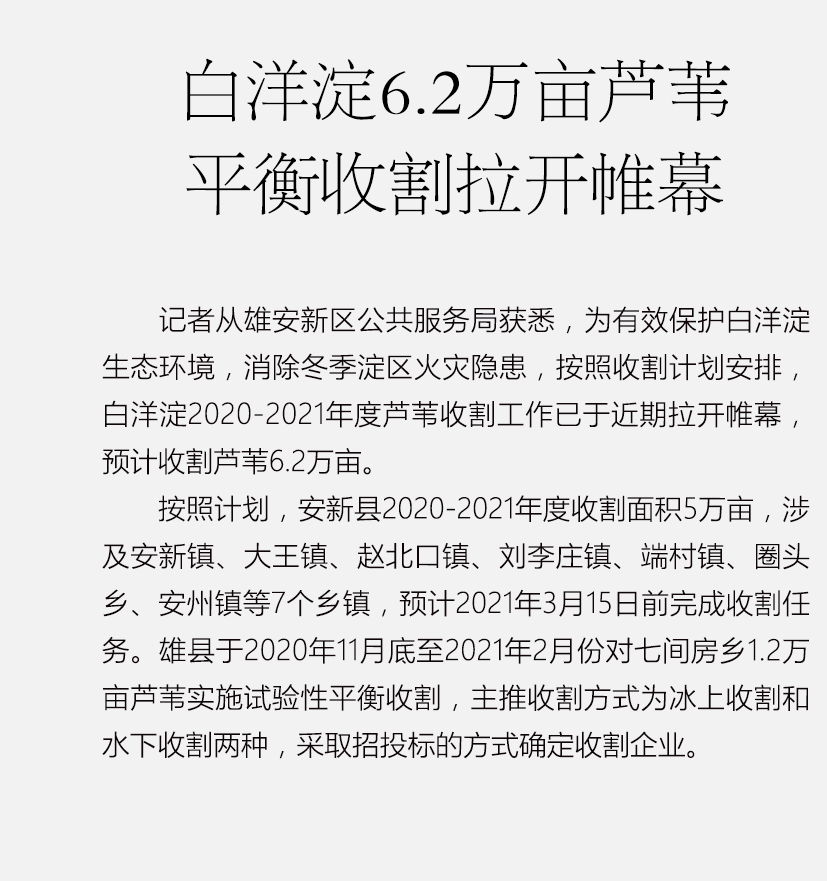 按照计划,安新县2020-2021年度收割面积5万亩,涉及安新镇、大王镇、赵北口镇、刘李庄镇、端村镇、圈头乡、安州镇等7个乡镇,预计2021年3月15日前完成收割任务。