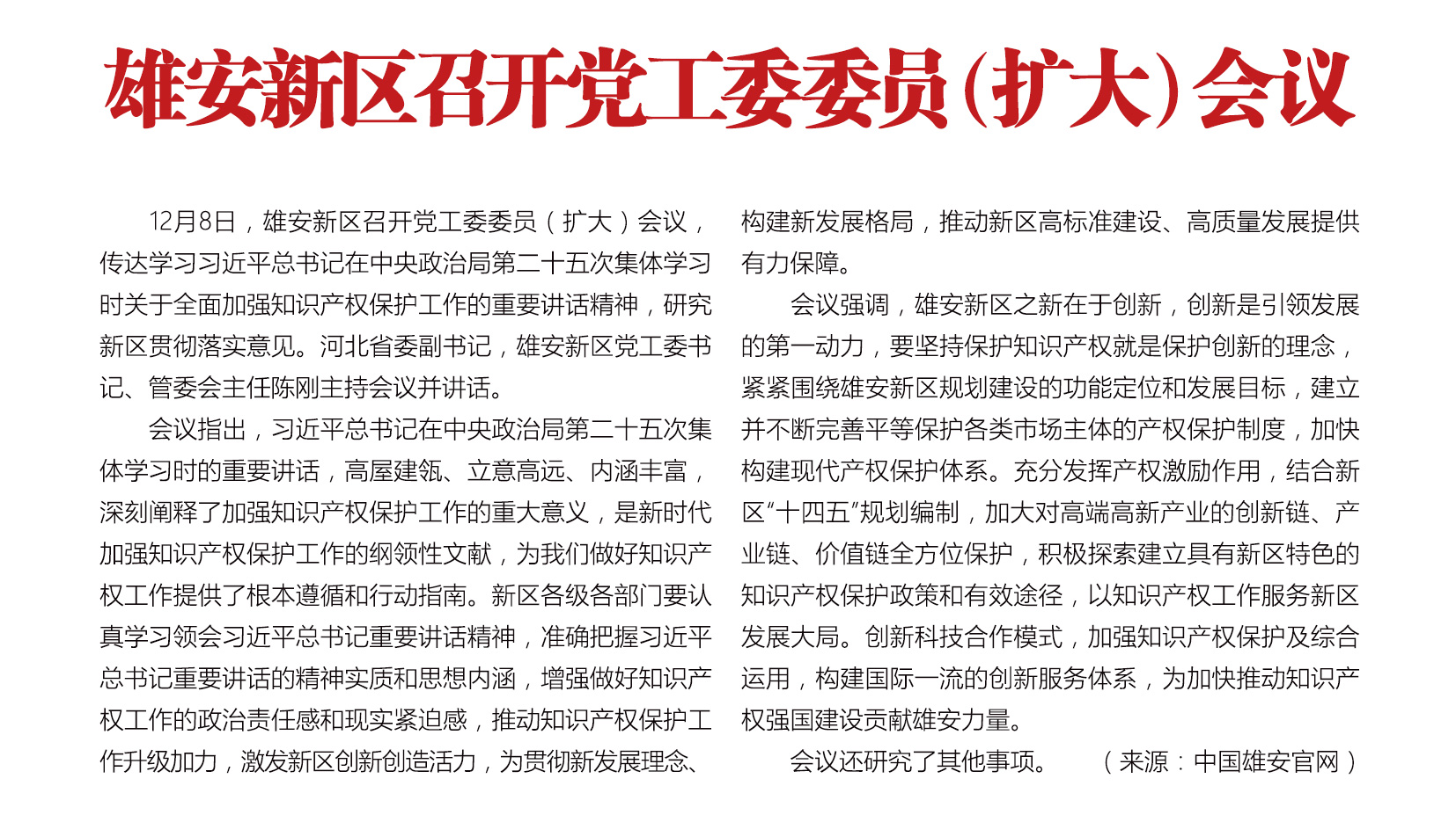 深入学习习近平总书记重要讲话精神,强化知识产权保护推动新区高质量建设发展。