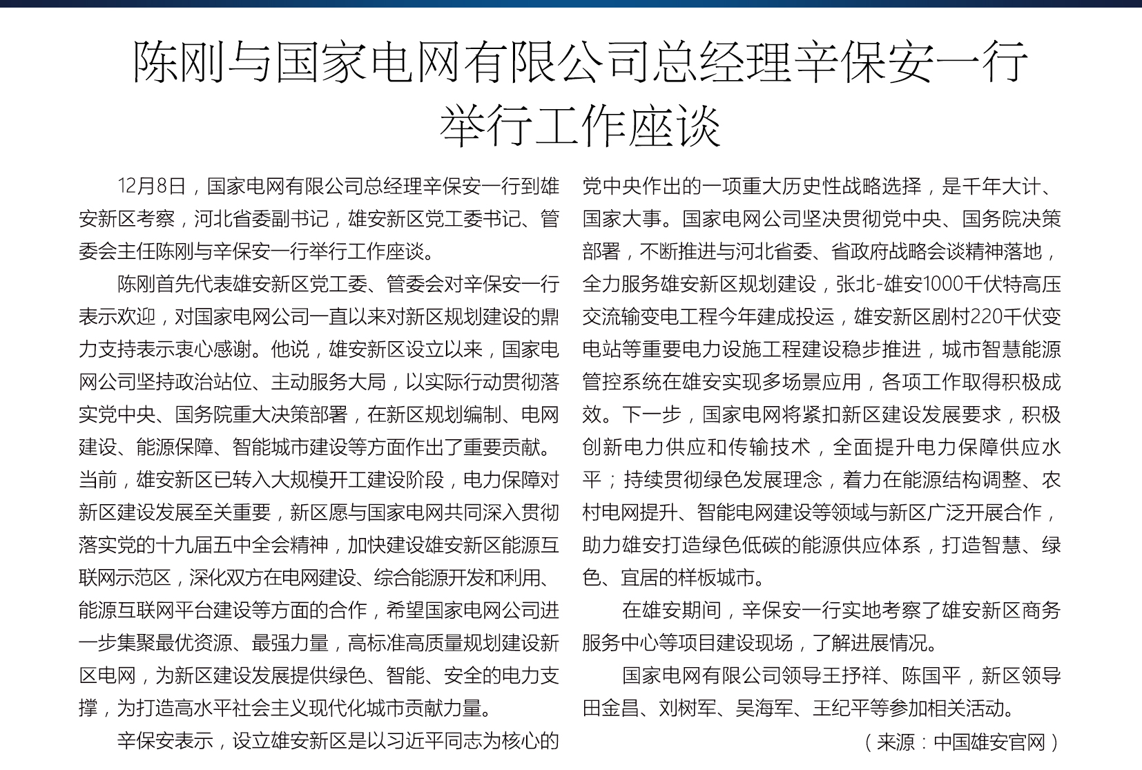陈刚与国家电网有限公司总经理辛保安一行举行工作座谈