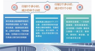 “津石高速公路通车后,从石家庄到天津的车辆只需在高速公路上行驶2个多小时,比之前减少1个小时的时间。从石家庄到雄安新区,车辆在高速公路上的行驶时间只需1个多小时,减少约半个小时。石家庄、雄安新区、天津三地将实现更紧密联结。”近日,指着津石高速公路的线路图,津石高速公路津冀界至保石界段总监办总监理工程师牛新利介绍。