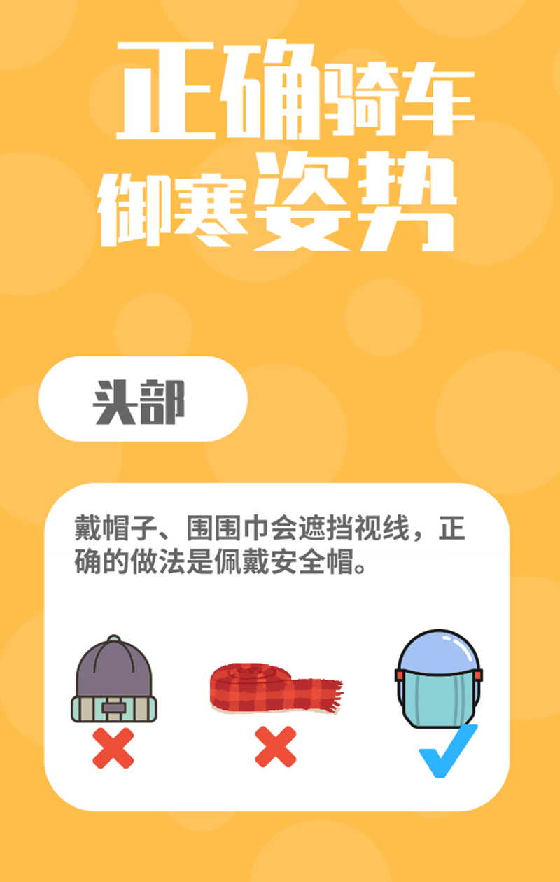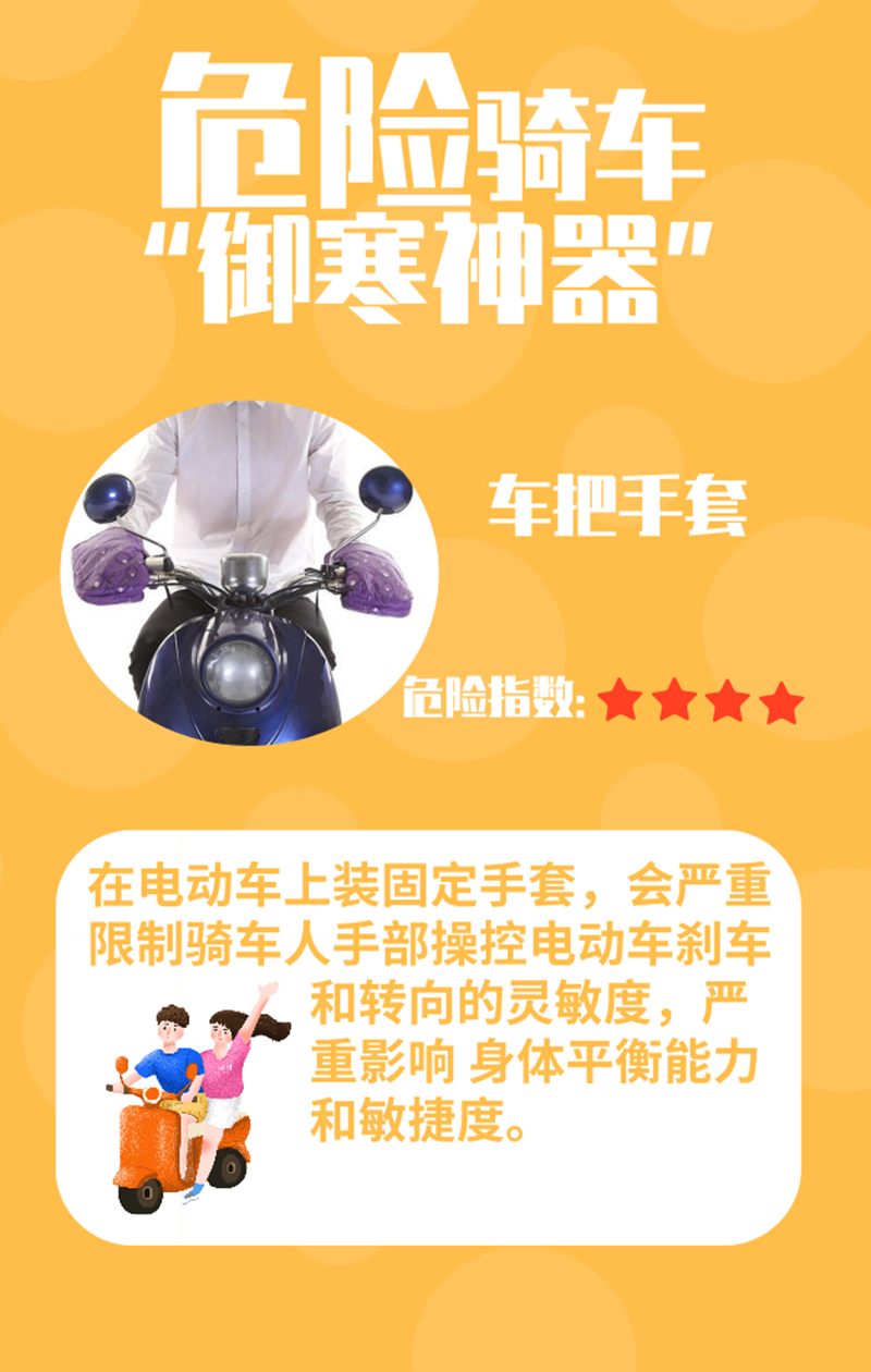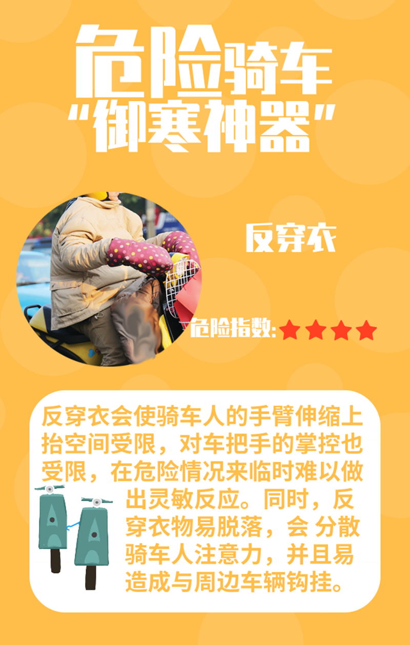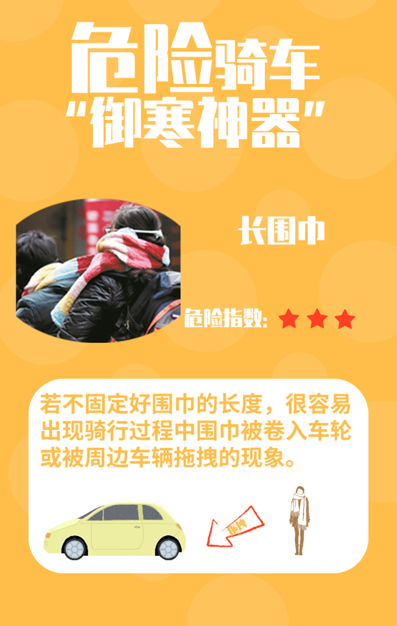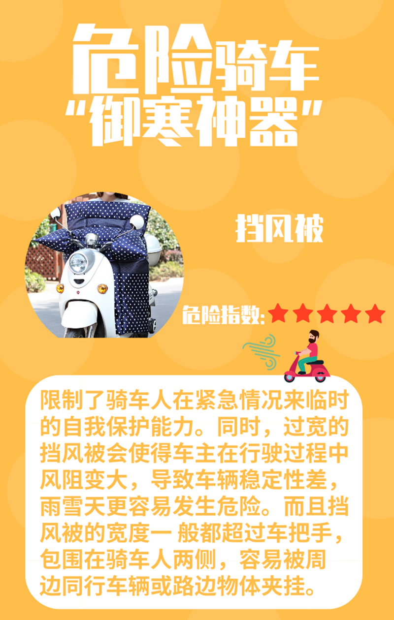 目前,电动自行车交通事故导致的死亡人数,在我国道路交通事故死亡人数中上升最快,越来越多人加入了电动自行车“大军”,骑行安全不能忽视!天气日渐寒冷,大家纷纷拿出自己的骑行“御寒神器”,但是这样安全吗?如何才能做好安全性最高的保暖出行呢?做好御寒工作的同时,一定要时刻注意骑行安全!