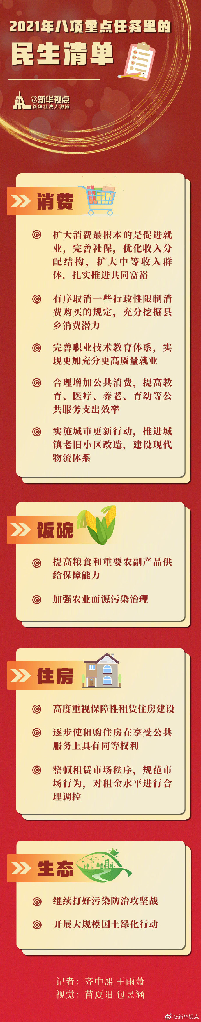 保障和改善民生始终是经济工作的重点。中央经济工作会议规划的2021年八项重点任务中,涉及民生的内容占有相当篇幅。记者从中梳理出这样一份“民生清单”,件件都与你我相关——