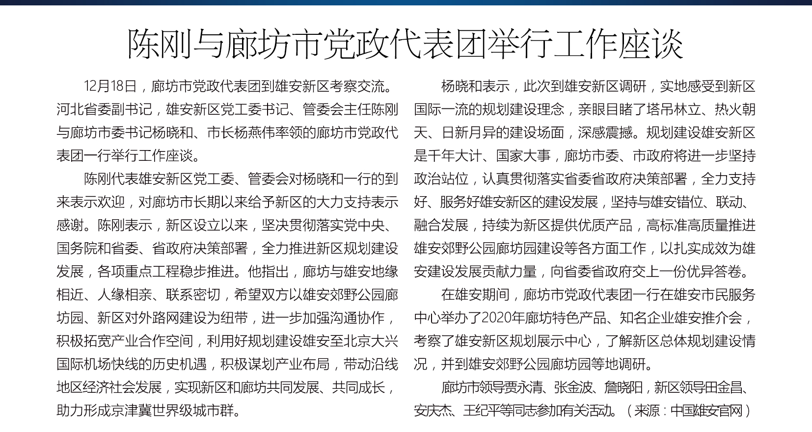 12月18日,廊坊市党政代表团到雄安新区考察交流。