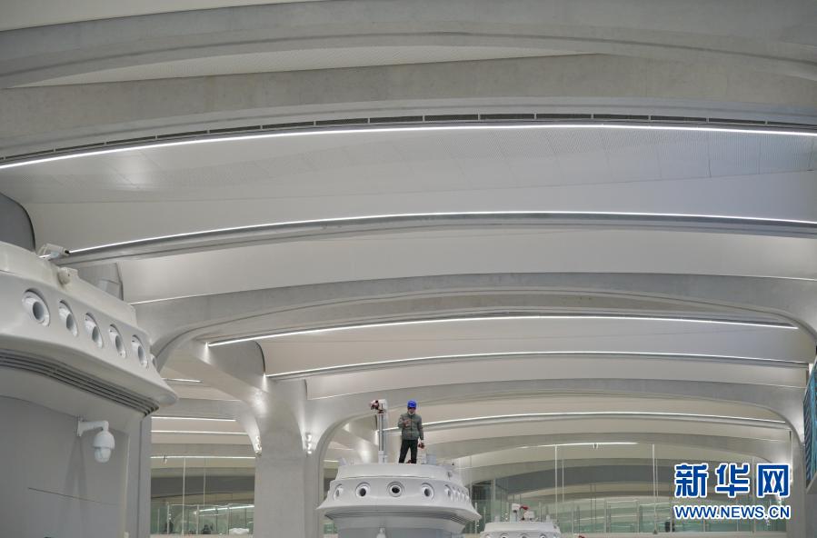 12月23日,工人在京雄城际铁路雄安站候车大厅内调试消防设备。