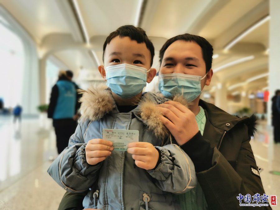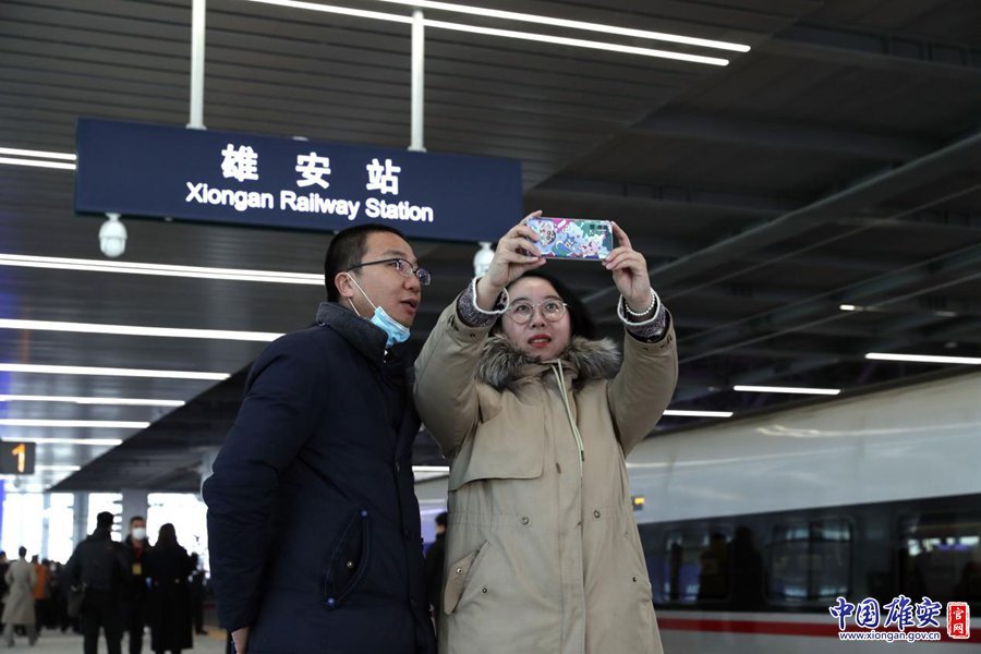 12月27日,在雄安站,乘坐C2702次列车的旅客在列车前拍照留念。刘东尧 摄
