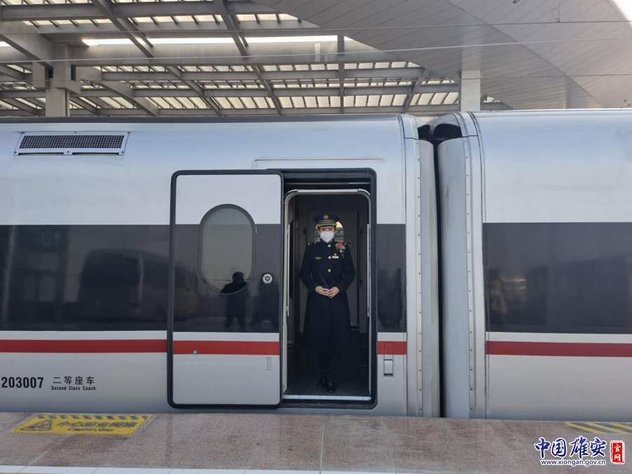 12月27日,乘务员在雄安开往北京西的C2702次列车旁迎接旅客上车。刘东尧 摄