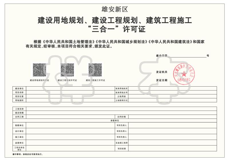 附:雄安新区建设用地规划、建设工程规划、建筑工程施工“三合一”许可证