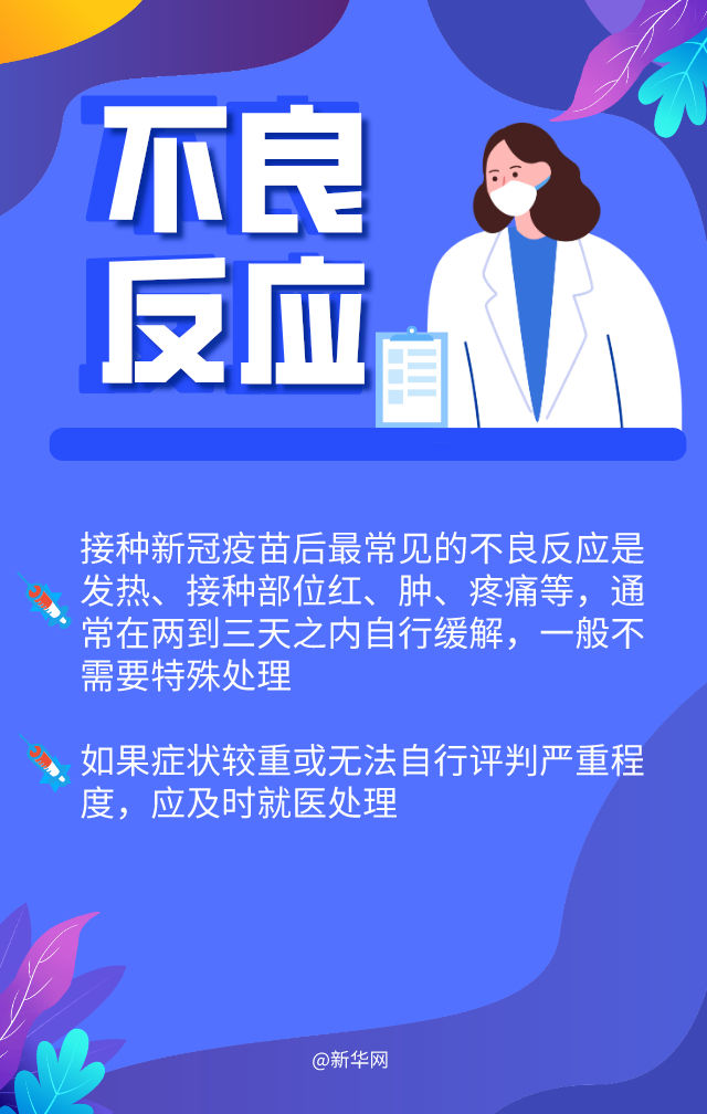 根据新冠病毒灭活疫苗接种知情同意书,局部不良反应以接种部位疼痛为主,还包括局部瘙痒、肿胀、硬结和红晕等,全身不良反应以疲劳乏力为主,还包括发热、肌肉痛、头痛、咳嗽、腹泻、恶心、厌食和过敏等。