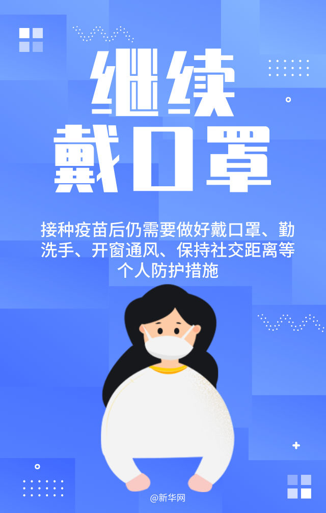 上海市健康促进中心提醒,即使接种了疫苗,“防疫三件套”(佩戴口罩、社交距离、个人卫生)和“防护五还要”(口罩还要戴、社交距离还要留、咳嗽喷嚏还要遮、双手还要经常洗、窗户还要尽量开)仍应牢记在心。