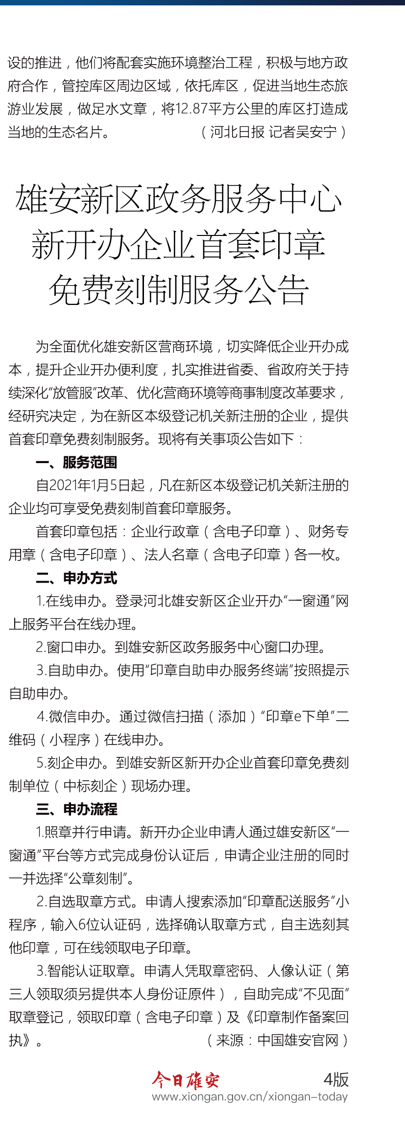 雄安新区政务服务中心新开办企业首套印章免费刻制服务公告