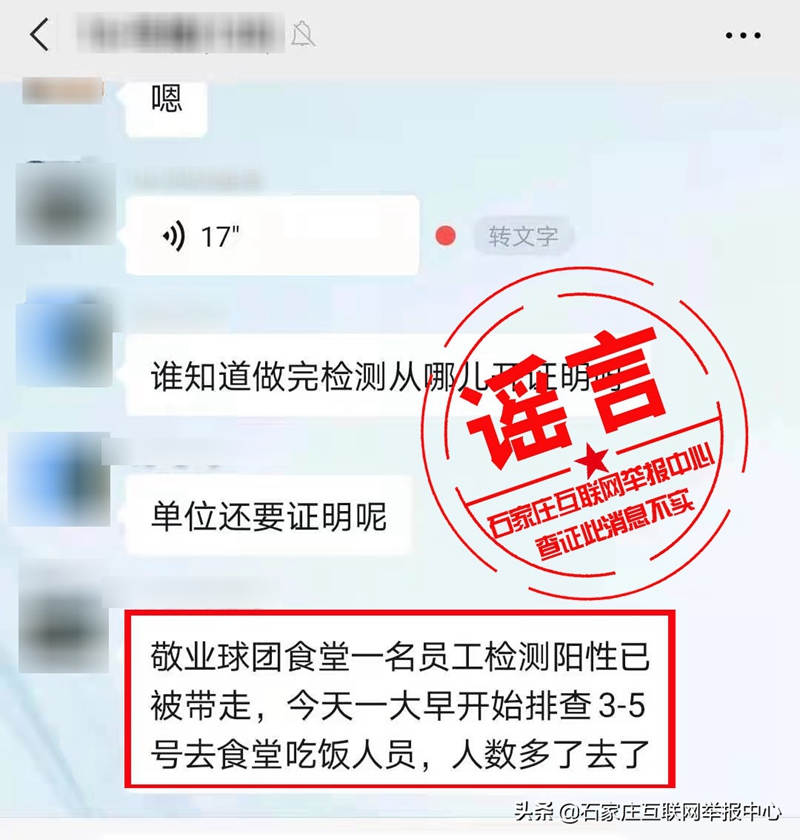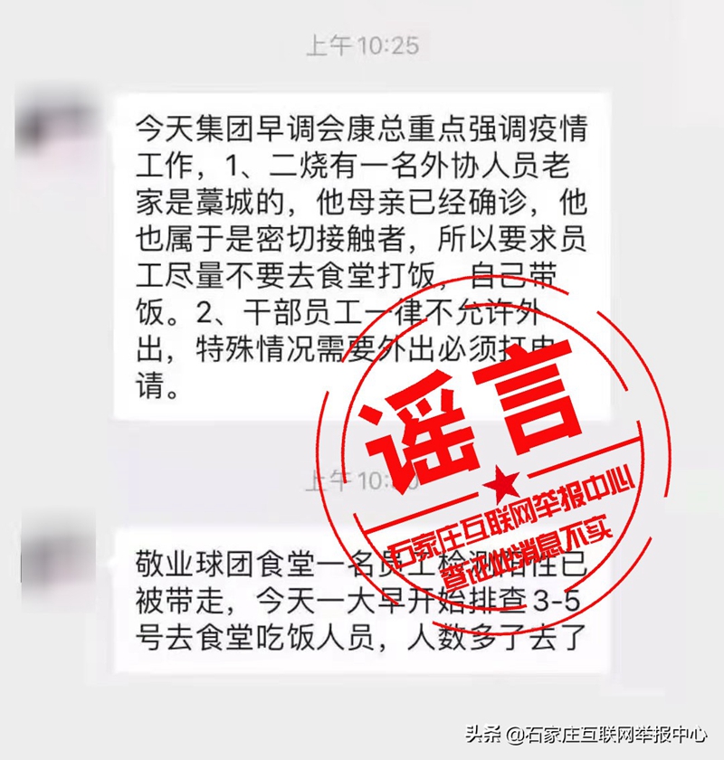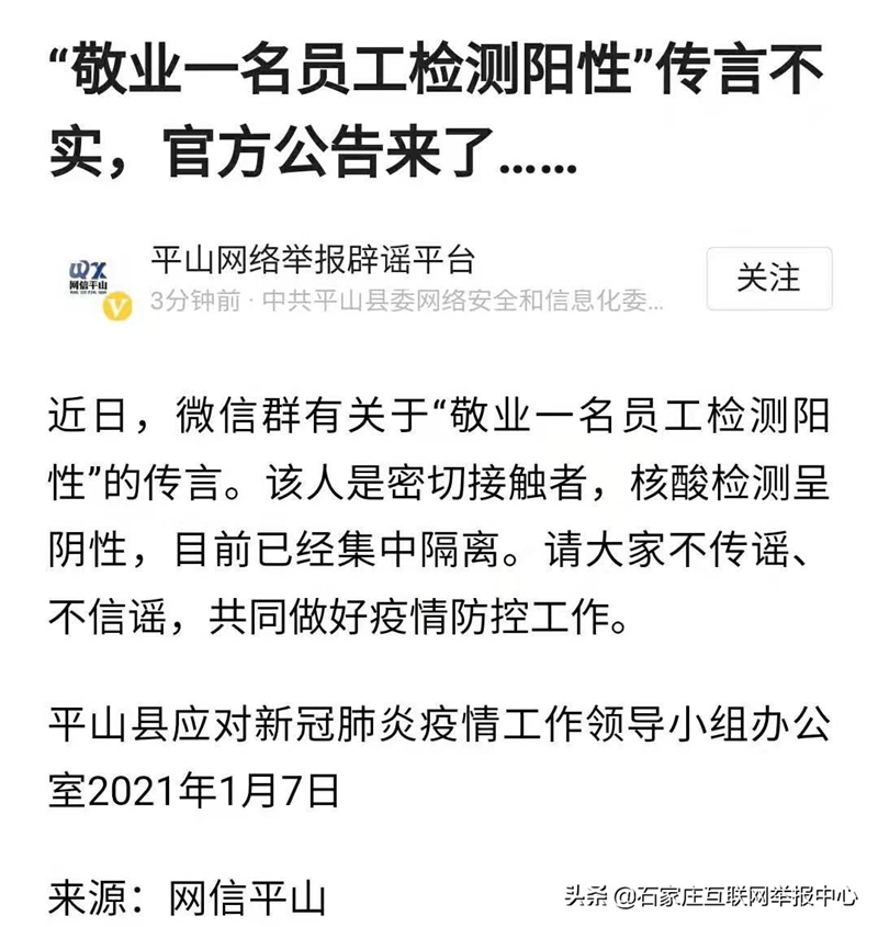 近日,有微信群流传“敬业集团一员工检测阳性”的消息,称一名食堂员工核酸检测为阳性,已被带走。据“平山网络举报辟谣平台”信息,平山县应对新冠肺炎疫情工作领导小组办公室证实,该网传消息为谣言。请大家不传谣、不信谣,共同做好疫情防控工作。