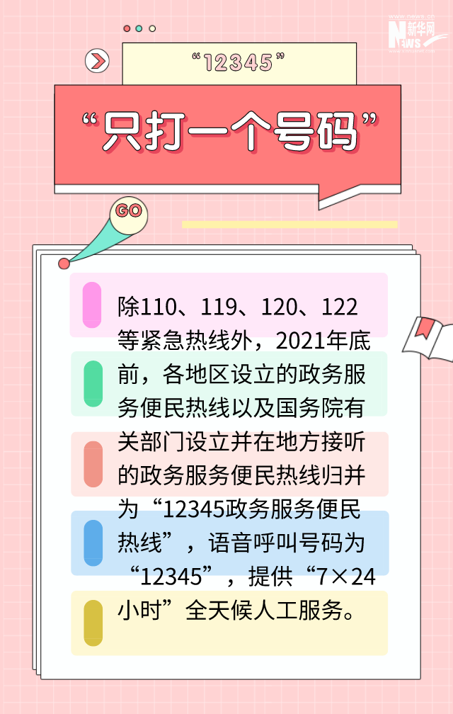 国办日前印发《关于进一步优化地方政务服务便民热线的指导意见》,明确今年底前,各地区设立的以及国务院有关部门设立并在地方接听的政务服务便民热线实现一个号码服务,各地区归并后的热线统一为“12345政务服务便民热线”。国新办7日举行国务院政策例行吹风会,围绕社会关切的热点问题进行了回应。