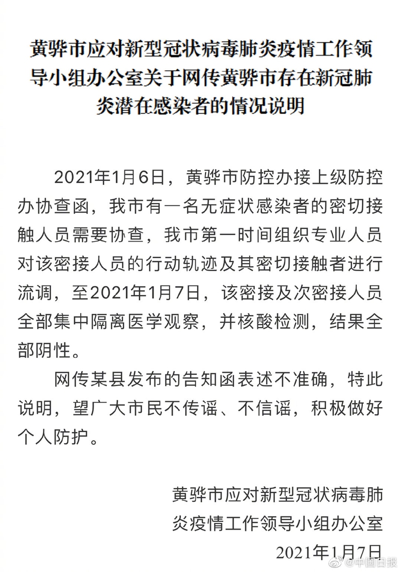 2021年1月7日,黄骅市应对新型冠状病毒肺炎疫情工作领导小组办公室通过微信公众号“健康黄骅”发布文章《关于网传黄骅市存在新冠肺炎潜在感染者的情况说明》。