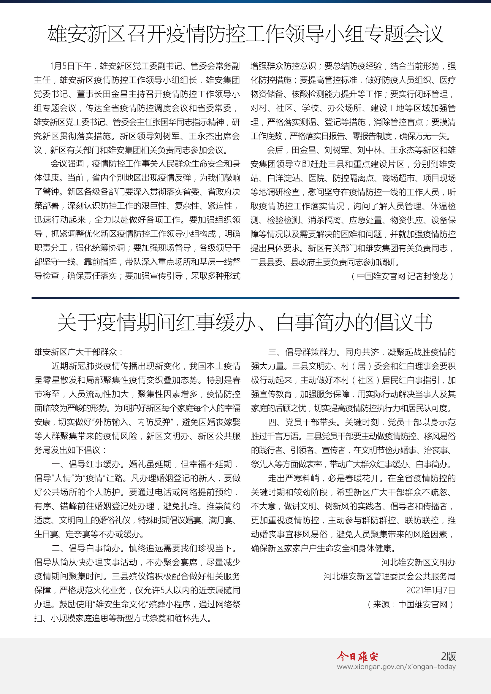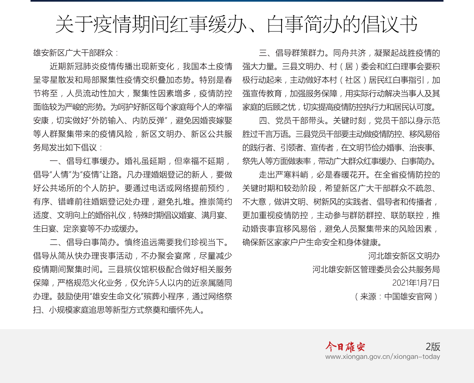 呵护好新区每个家庭每个人的幸福安康,切实做好“外防输入、内防反弹”,避免因婚丧嫁娶等人群聚集带来疫情风险。