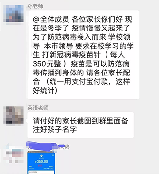 诈骗分子冒充老师,悄悄潜入学校的班级群里,以收取新冠疫苗费用为由,对群内家长进行诈骗。