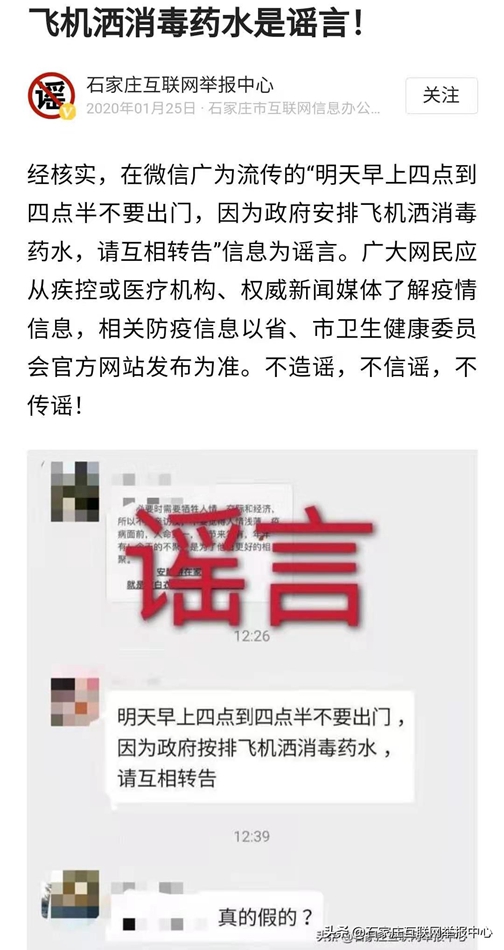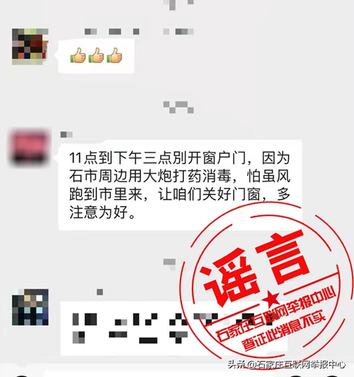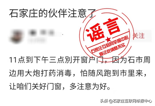 近日,微信、头条等平台流传着一则“11点到下午三点别开门窗,因为石市周边用大炮打药消毒,怕随风跑到市里来,让咱们关好门窗,多注意为好”的消息,经石家庄互联网举报中心向市防疫相关部门核实,该消息为谣言。