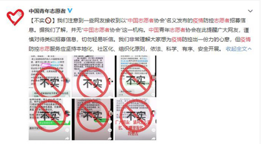 近日,中国青年志愿者协会官方微博发布消息称,网传“中国志愿者协会招募疫情防控志愿者”等消息系不实信息。