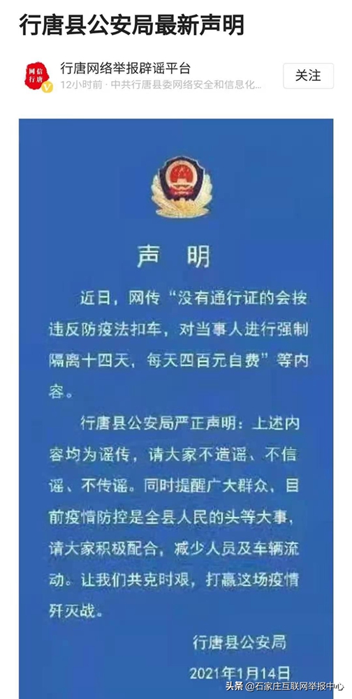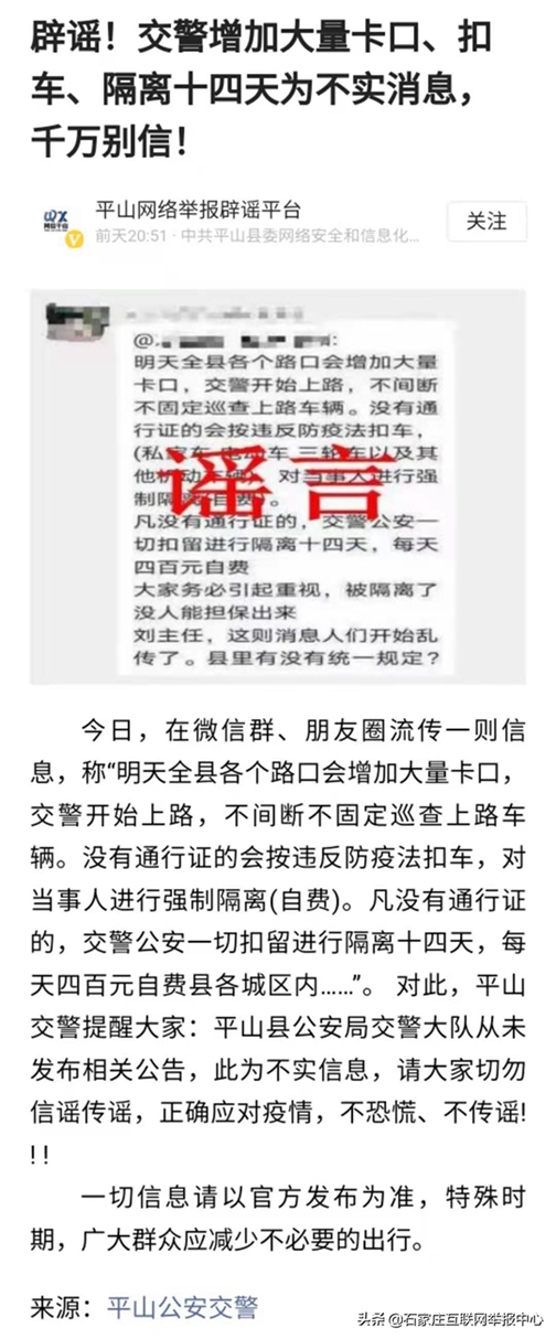 近日,微信群、朋友圈流传着一则石家庄某地“出去瞎转的一律被抓走,隔离十四天,每天每人四百元”的消息。石家庄互联网举报中心根据消息显示的村庄和小区,向新乐市相关部门核实,证实该消息为谣言。据检索,此前网传谣言还有“交警上路查车,无通行证的扣车、隔离十四天”等版本,石家庄市平山县、行唐县等多地已辟谣。