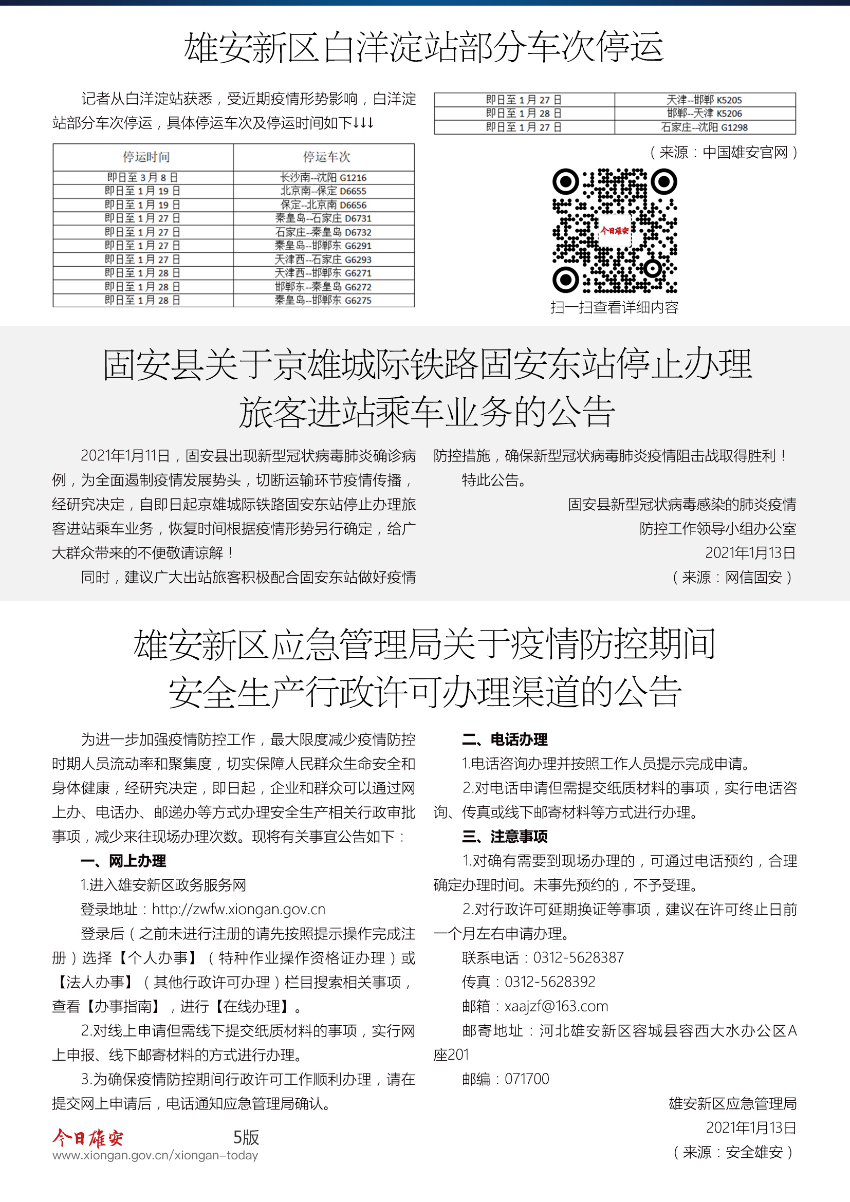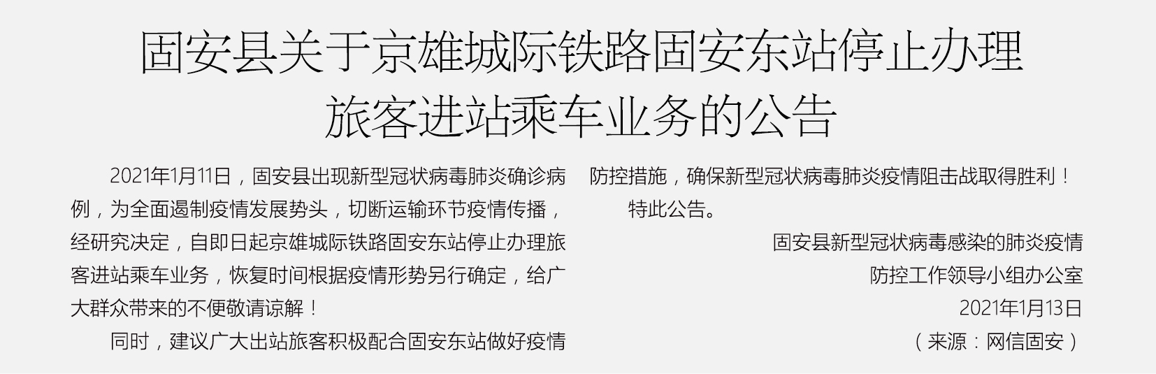 固安县关于京雄城际铁路固安东站停止办理旅客进站乘车业务的公告