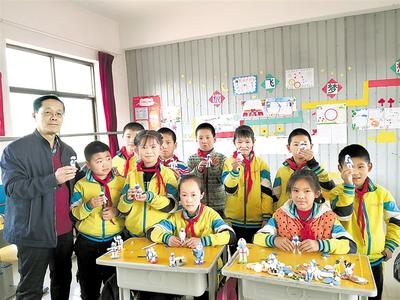 北京市陶然亭小学原校长刘建文(左一)为阜平县半沟小学学生上手工课。阜平县教育局供图