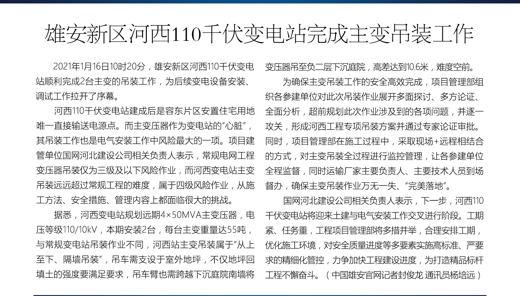 雄安新区河西110千伏变电站顺利完成主变吊装工作